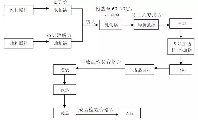 按工艺要求在水相锅中投入称好的水相类原料,搅拌加热到80℃,在油相锅中投入称好的油相类原料于85℃完全溶解。将乳化锅预热至60~70℃,抽真空吸入水相及油相,均质搅拌,冷却至45℃加入香精及添加物,搅拌至均匀后出料。半成品检验合格后灌装,成品检验合格后入库。
